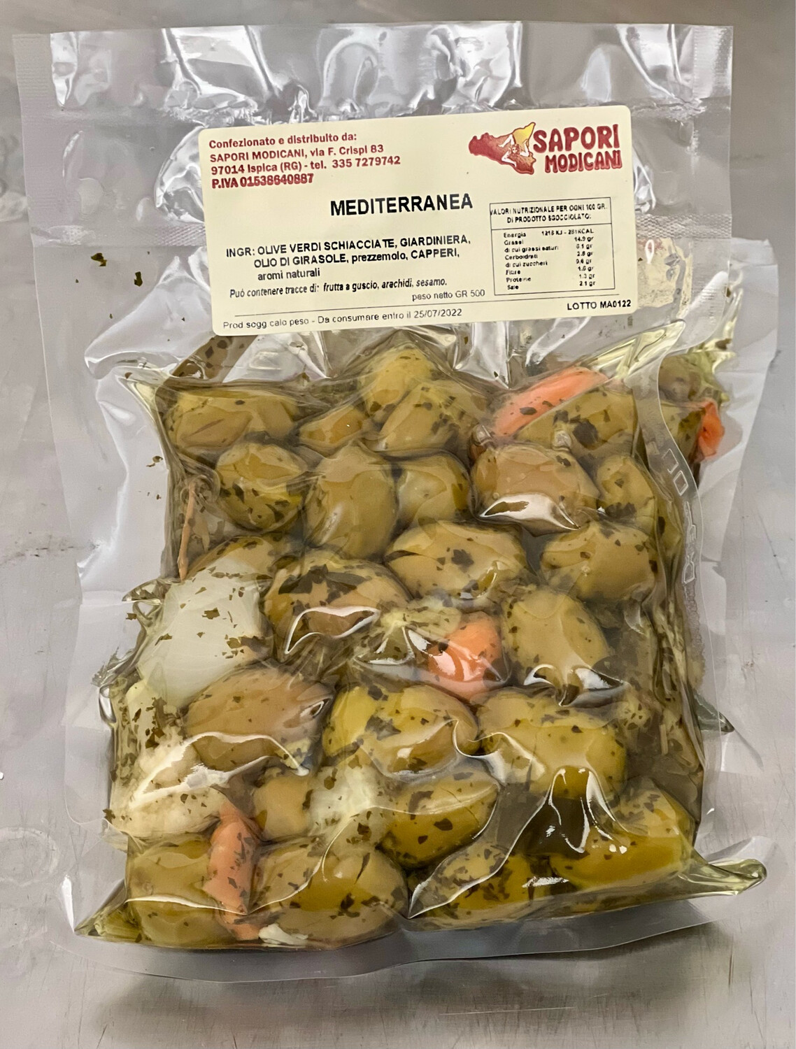 Olive schiacciati condite con giardiniera e aromi, in buste sottovuoto